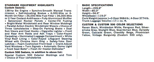 Sedan model in Guardsman Blue. The base price of the Custom 2-door Sedan is: $2,350. The base price of the Custom 4-door Sedan is: $2,404. The base price of the Custom 500